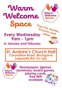 During January and February join us on a Wednesday for a warm drink, and a slice of cake or toast along with a chance for a chat or to play a game, do a jigsaw or read a paper. All are welcome, just come along between 9am and 1pm.